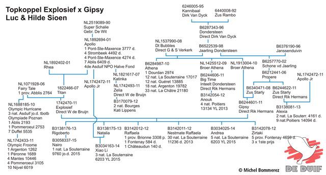 We besparen u de gedetailleerde afstammingen van deze zes parels. Toch dit: het blijft echt wel in de familie! Zo zijn Nairo (uit Rigoberto) en Xiao Li (uit Natalia) kleinkinderen van het koppel Explosief x Gipsy terwijl Andrea direct uit genoemd koppel komt. Even het geheugen opfrissen: uit dat koppel hadden we al Zirtaki, Raffaela en haar nestmaat. We mogen dus stilaan van een geweldig kweekkoppel gewagen. Alexia is dan weer een nicht van dezelfde Gipsy. Dat de “Zus Willemina” een zus is van Willemina 1 nat. Poitiers 2014 en nicht van Nomi 1 nat. Poitiers 2013 spreekt voor zich. We zegden het: het blijft in de familie.