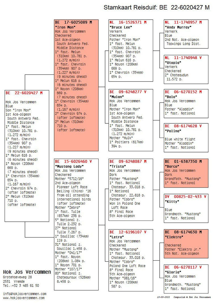 En grootvader van o.a. 20-065 “Cuba” (zie koop 78), 20-218 (46e Nat. Argenton 21.282 d., 3e Sermaises 1556 d. en 4e Sermaises 1917 d.), 20-605 (1e Sermaises 1929 d. en 2e Nat. Zone Argenton 1615 d.), 21-296 (1e Melun 1202 d.) en 21-297 (1e Quievrain 418 d.).