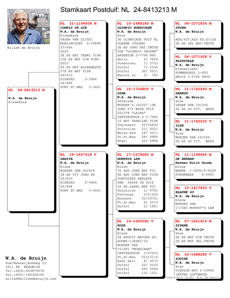 Een ongeëvenaarde kweker en de primus inter pares van het hok. Zelf een fenomenale vlieger als jonge duif en als jaarling, en nu een kweker die op dit moment zijn gelijke niet kent. Zijn directe kinderen zijn echt top, en zijn kleinkinderen verbazen alles en iedereen. Hij is o.a. grootvader van “Amalia”, 1e Nat. Asduif Jong Midfond Pipa Ranking 2022, “Alexia”, 1e Nat. Asduif Jong Fondspiegel 2022 en “Olympic Pure Gold”, 1e Olympiadeduif jong NL Maastricht 2024!!