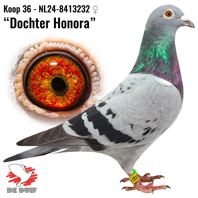 “Honora” is een volle zuster van “Baron” (6e Nat. Asduif Jong Pipa Ranking, 8e Nat. Asduif Jong NPO), 22-780 (6e Asduif Jong Vitesse SS Gouwe-IJssel en 40e Nat. Asduif Jong Pipa Ranking), 22-814 (5e Asduif midfond SS ouwe-IJssel en 23e Nat. Asduif Midfond Pipa Ranking) 22-725 (1e Duffel 5171 en snelste 10.397 d.) 23-903 (met in 2024 o.a. 2e Pontoise 24.339 d., 3e Melun 21.811 d., 7e Fontenay 15.196 d.) en 24-901 (7e St Soupplets 5262 d.)