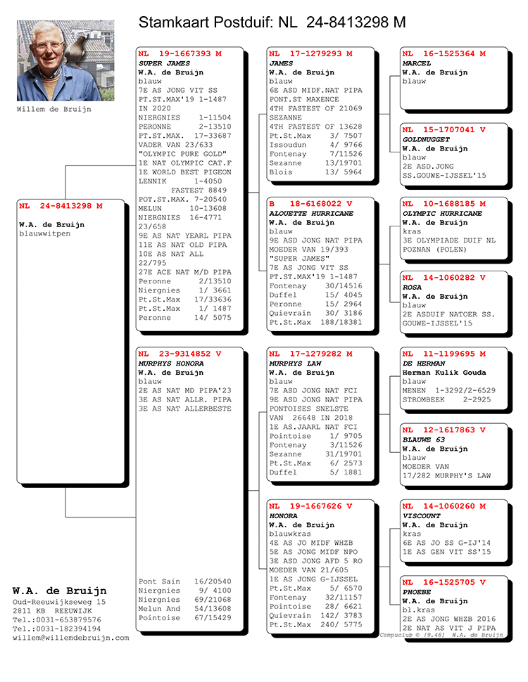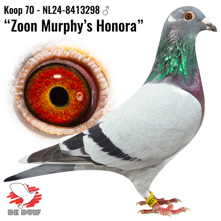 Zoon van “Super James” (o.a. 1e Niergnies 11.504 d. en vader van 1e Olympiadeduif NL jonge duiven Maastricht 2024 en 1e Nat. Asduif jong NL World Best Pigeon) x “Murphy’s Honora” (2e Nat. Asduif midfond jong en 3e Nat. Asduif jong Pipa Ranking 2023 en 3e Nat. Asduif Jong De Allerbeste).