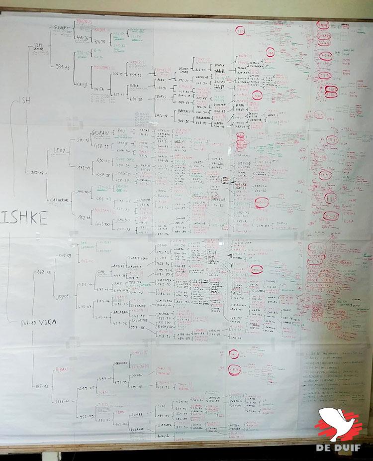 Om dat te staven ging Tim een stapje verder. Hij werkte de meest uitgebreide stamkaart uit die ik van een duif ooit gezien heb. Het was meteen ook de grootste. We dienden wat meubels te verhuizen ten huize Deweerdt om ze volledig te ontrollen. De stamkaart toont meteen hoe de familie Deweerdt de eigen stam duiven trouw is gebleven. De topduiven van de seventies, eighties en nineties hebben allemaal een plaatsje in de stamkaart van ‘Ishke’ weten te bemachtigen.