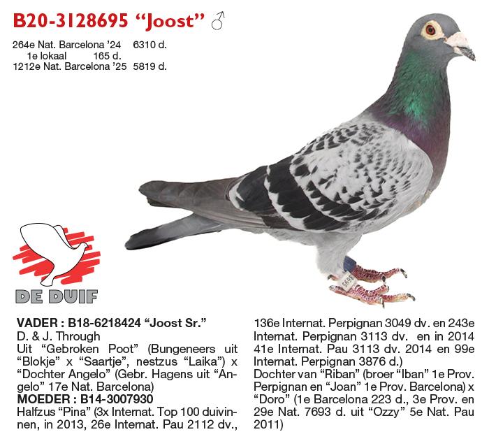 Als laatste zetten we graag ‘Joost’ in de picture. Deze wondermooie doffer vloog in 2024 naar de lokale overwinning uit Barcelona. Dit was eveneens goed voor een 18de provinciaal van 1.224 duiven. Bij zijn afstamming zien we als moeder een dochter van opnieuw ‘Riban’. Het toont dat deze lijn zijn stempel drukt op de kolonie. De vader van ‘Joost’ kwam er via D. & J. Dierynck en toont de edele soort van Frans Bungeneers en de gebroeders Hagens.