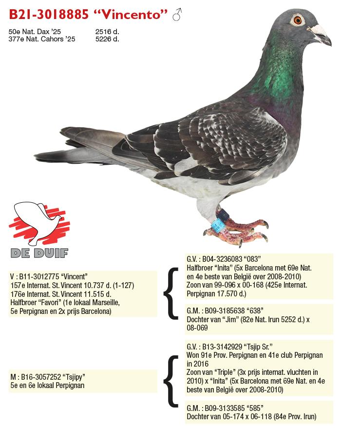 Zoals reeds aangegeven, worden de duiven op twee plaatsen gespeeld. Op het hokje bij Filip huizen er eveneens een 25 oude duiven en jaarlingen. Ondanks de beperkte tijd die Filip ter beschikking heeft, blijft hij met veel passie strijden voor de eer van de familie. Hij moest in 2025 zijn meerdere erkennen in de tweestrijd, maar kan terugvallen op een aantal mooie resultaten. Voor een topnotering zorgde ‘Vincento’. Hij vlagde op de snoeiharde Dax af als 2de lokaal na ‘Ishke’ en rijfde hiermee ook de 50ste nationaal binnen. ‘Vincento’ is een zoon van ‘Vincent’. Deze klepper vloog bij Filip naar de 44ste nationaal Sint-Vincent. In zijn afstamming zien we met ‘Emiel’ en ‘Joan’ de oude krijgers van de kolonie. De moeder van ‘Vincento’ luistert naar ‘Tsjipy’. Zij etaleerde haar klasse met mooie noteringen uit Perpignan. Zij is eveneens een kleindochter van klasbak ‘Inita’, die vijf keer op Barcelona haar klasse toonde met onder andere een 69ste nationaal.
