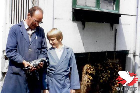 Nico: “Van origine komen we uit de Vlaamse Ardennen, regio Berchem-Kluisbergen. Daar woonden mijn pépé en mémé van moederskant. Op het hok van pépé ben ik besmet met de duivenmicrobe. Het was daar heel kleinschalig. Zes kweekkoppeltjes, negen vliegduiven en twintig jongskes. Meer moest dat niet zijn. Ik heb een foto uit die tijd gevonden. Ik sta als tienjarige naast pépé. Moeilijk te zeggen wie de fierste was. Als 14-jarigen werkten Caroline en ik al in de duivenbond. Gummi’s opschrijven en uitslagen maken. Dat was nachtwerk voor een beetje drinkgeld. Na ons huwelijk hebben we 8 jaar in het huisje naast pépé en mémé gewoond. Piepklein huisje, een deurtje en een raampje, maar perfect. Ik geef een voorbeeld waar alles in zit. Als we naar het werk vertrokken en een wasmachine lieten draaien, liet pépé de was drogen op de draad en zorgde mémé dat ’s avonds alles gestreken en geplooid was. Ik speelde in tandem met de duiven met pépé en had ook mijn eigen hokje. Er stond wat kotterie in de tuin en we hingen er een spoetnik aan. Toen heette dat duivenhok.