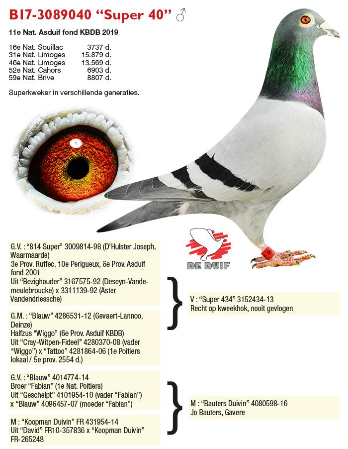Eén van de vaandeldragers bij Nico is de “Super 040” met 16e Nat. Souillac, 31e en 46e Nat. Limoges, 52e Nat. Cahors, 59e Nat. Brive en 11e Nat. Asduif fond. Op het kweekhok is hij aan het uitgroeien tot de nieuwe stamvader met drie generaties kopvliegers. Het is het kaliber “Souillac Man” (7e Nat. Souillac, 44e en 69e Nat. Libourne, 85e Bourges), “Super 202” (3e Nat. Souillac, 3e en 6e Prov. Chateauroux, 57e Nat. Tulle), “Philip” (in 2025 als jaarling 40e Nat. Libourne, 44e Nat. Souillac, 55e Nat. La Souterraine, 103e Nat. Limoges en twee kopprijzen op Ecouen, Maissemy) en de “758” (8e Nat. Souillac jl. 2025).