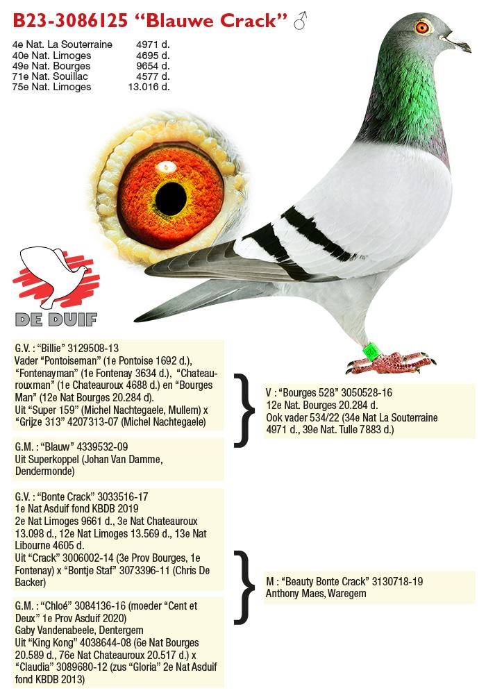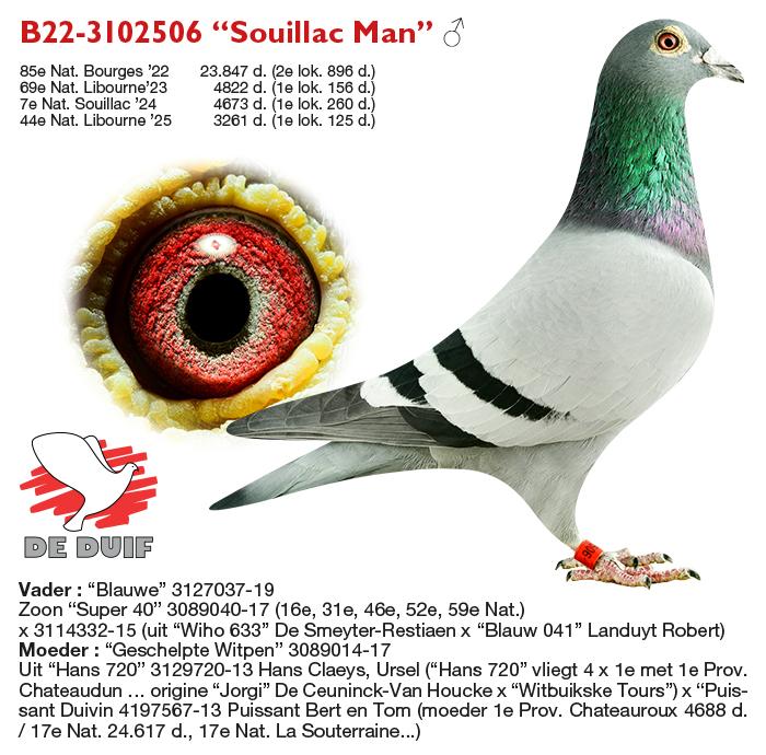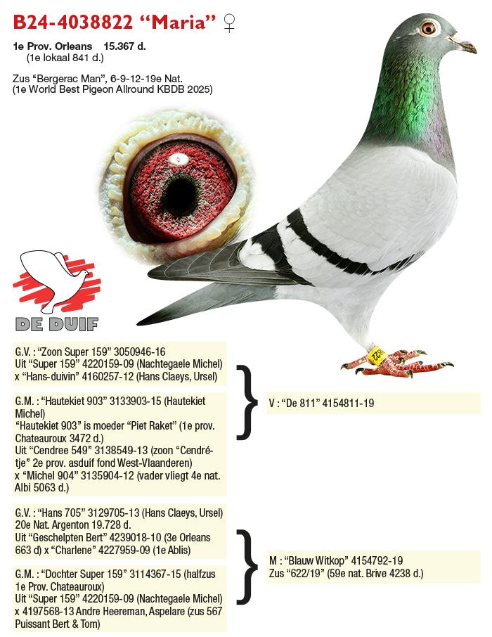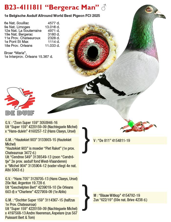 De duif in de kijker is natuurlijk de “Bergerac Man”, 1e World Best Pigeon Allround 2025. Een goede is een droom en de “Bergerac Man” is een droom die uitkomt. Hij wint 6e Nat. Souillac, 9e Nat. Limoges, 12e Nat. La Souterraine, 19e Nat. Bergerac en op de korte afstand 1e Pont 1114 d., 11e Prov. Chateauroux en 18e Prov. Orleans.
