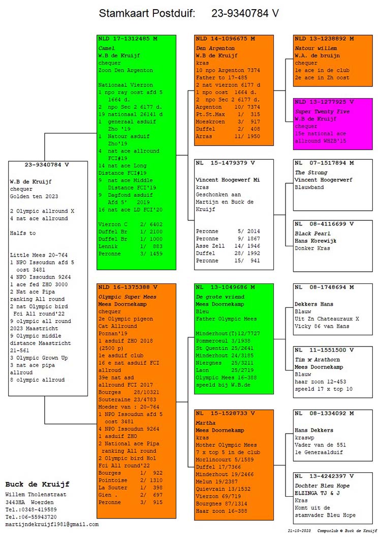 Ook moeder van 17-476 (3x 1e bij Wim Overdijk), 22-571 (24e Nat. Asduif jong NPO), 18-453 (3-4-7-10e tegen 1000 duiven gemiddeld) en grootmoeder van 7e en 9e NPO Chalons 3634 d. (bij Gerjan Heerkes) en 2e Bierges 9475 d. (in dezelfde seconde als hokgenoot bij Kamp/Kippers).