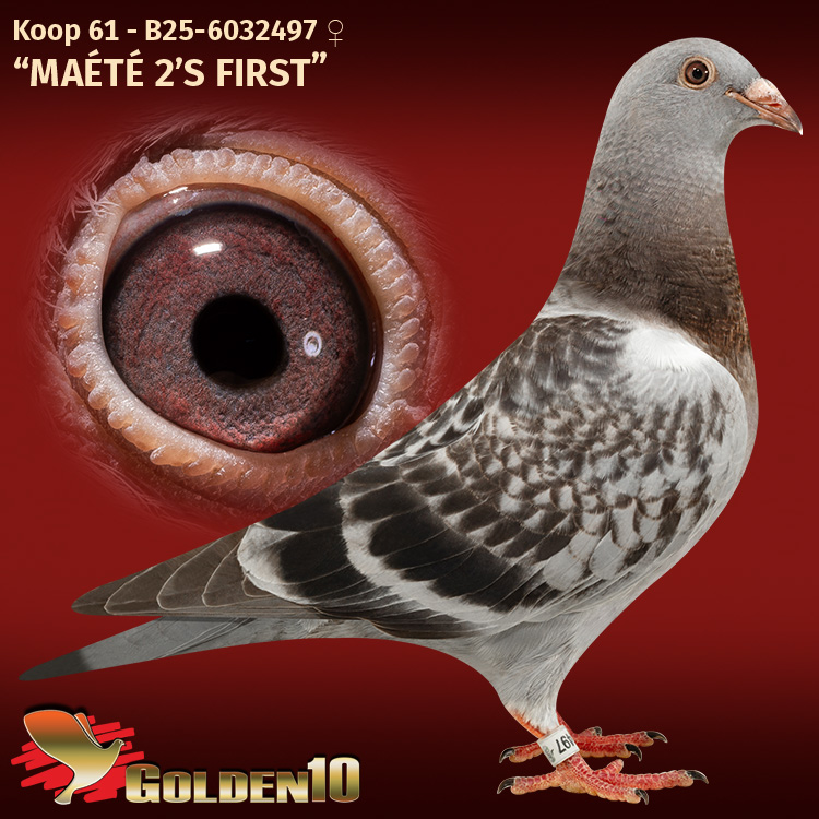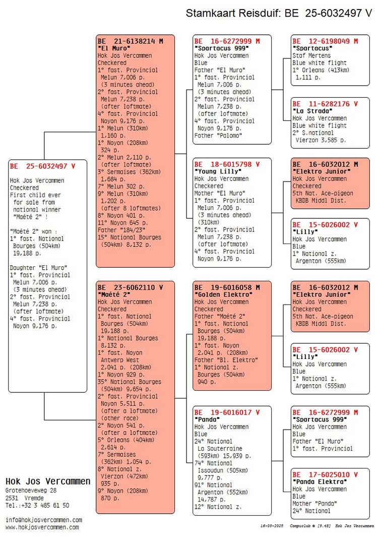 Bewezen kweekster uit “Elektro Junior” (5e Nat. Asduif kleine hafo KBDB) x “Lilly” (1e Prov. Argenton 1517 d. / 1e Nat. Zone 3961 d. en 3e Nat. 13.730 d.).