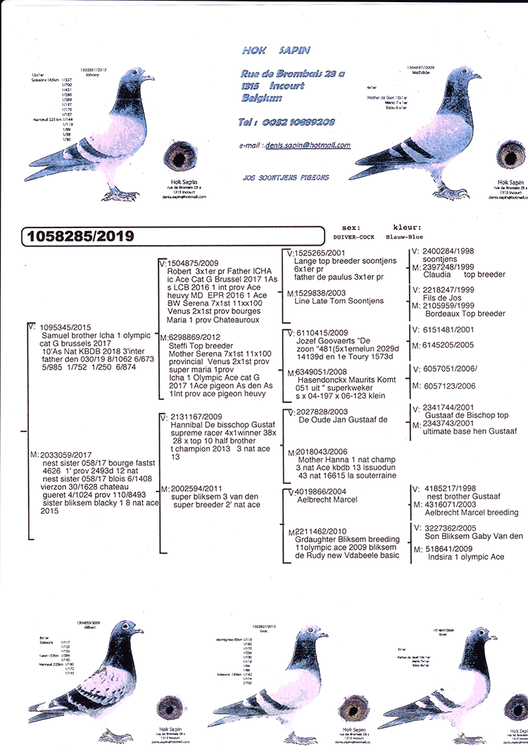 Zoon van een superkoppel en broer van o.a. “Icha” (1e Olympiadeduif jaarse Brussel 2017, 1e Prov. Asduif zware halve fond jaarse, 1e Interprov. Bourges 1788 d. / 15e Nat. 10.173 d., 1e Prov. Bourges 485 d. / 3e S-Nat. 4208 d., 1e Prov. Bourges 286 d. / 2e Interprov. 1460 d., 1e Soissons 358 d. etc.), “Serena” (1e Prov. Asduif zware halve fond oude 2016 met 1e Interprov. La Souterraine 1127 d., 1e Prov. Argenton 240 d., 1e Interprov. Chateauroux 678 d., 2e Interprov. Argenton 1131 d. en nog 4x 1e), “Venus” (1e Interprov. Bourges 1817 d. en 1e Prov. Bourges 433 d. / 3e Interprov. 2277 d.), “Maria” (1-5-7-8-10e prov.) etc.