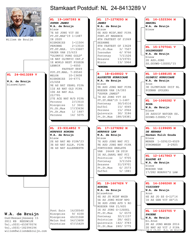 Een volle broer van “Super James” is vader van de “Geeloger” 1e Nat. Asduif Allround KBDB bij Erik Limbourg (thans @ Eijerkamp H. en E.J.)