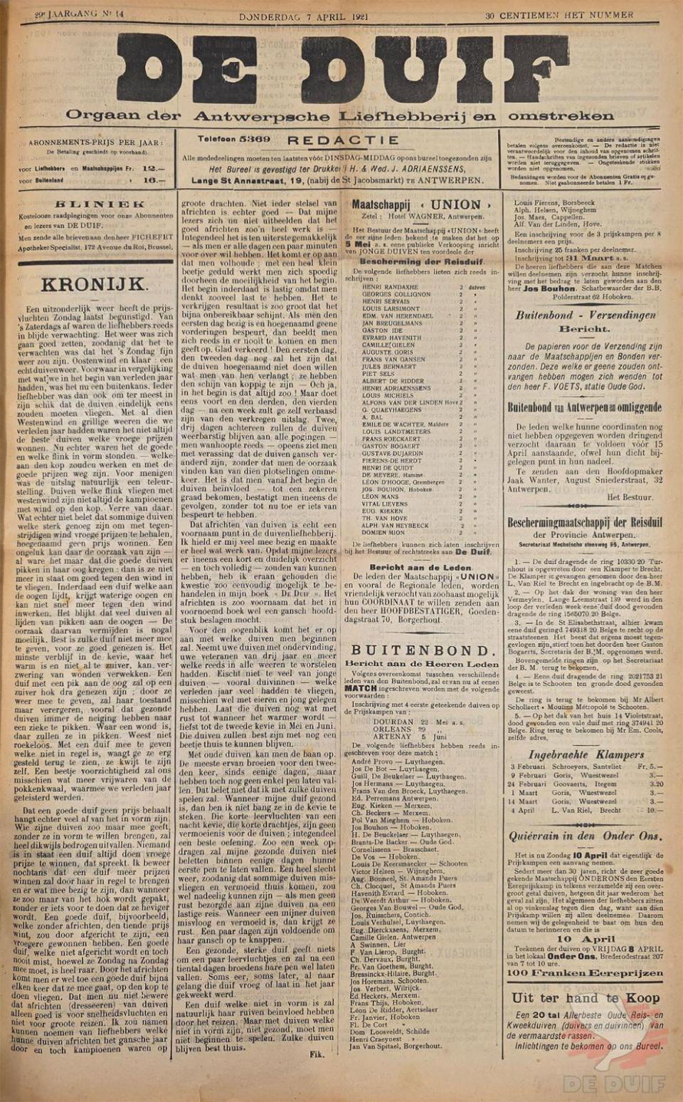 Een uitzonderlijk weer heeft de prijsvluchten Zondag laatst begunstigd. Van ’s Zaterdags af waren de liefhebbers reeds in blijde verwachting. Het weer was zich gaan goed zetten, zoodanig dat het te verwachten was dat het ’s Zondag fijn weer zou zijn. Oostenwind en klaar : een echt duivenweer. Voorwaar in vergelijking met wat wij in het begin van verleden jaar hadden*, was het nu een buitenkans. Ieder liefhebber was dan ook om ter meest in zijn schik dat de duiven eindelijk eens zouden moeten vliegen. Met al dien Westenwind en grillige weeren die we verleden jaar hadden waren het niet altijd de beste duiven welke vroege prijzen wonnen. Nu echter waren het de goede en welke flink in vorm stonden – welke aan den kop zouden werken en met de goede prijzen weg zijn. Voor menigen was de uitslag natuurlijk een teleurstelling. Duiven welke flink vliegen met westenwind zijn niet altijd de kampioenen met wind op den kop. Verre van daar. Wat echter niet belet dat sommige duiven welke sterk genoeg zijn om met tegenstrijdigen wind vroege prijzen te behalen, hoegenaamd geen prijs wonnen. Een ongeluk kan daar de oorzaak van zijn – al ware het maar dat die goede duiven pikken in haar oog kregen : dan is ze niet meer in staat om goed tegen den wind in te vliegen. Inderdaad een duif welke aan de oogen lijdt, krijgt waterige oogen en kan niet snel meer tegen den wind inwerken. Het blijkt dat veel duiven al lijden van pikken aan de oogen – De oorzaak daarvan vermijden is nogal moeilijk. Best is zulke duif niet meer mee te geven, voor ze goed genezen is. Het minste verblijf in de kevie, waar het warm is en niet al te zuiver, kan verzwering van wonden verwekken. Een duif met een pik aan de oog zal op een zuiver hok dra genezen zijn ; door ze weer mee te geven, zal haar toestand maar verergeren, vooral dat gezonde duiven immer de neiging hebben naar een zieke te pikken. Waar een wond is, daar zullen ze in pikken. Weest niet roekeloos. Met een duif mee te geven welke niet in regel is, waagt ge ze erg gesteld terug te zien, ze kwijt te zijn zelfs. Een beetje voorzichtigheid zal ons misschien wat meer vrijwaren van de pokkenkwaal, waarmee we verleden jaar geteisterd werden.