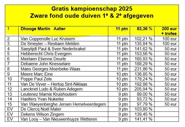 1e Kampioen zware fond oude duiven O.V.V. (1+2)