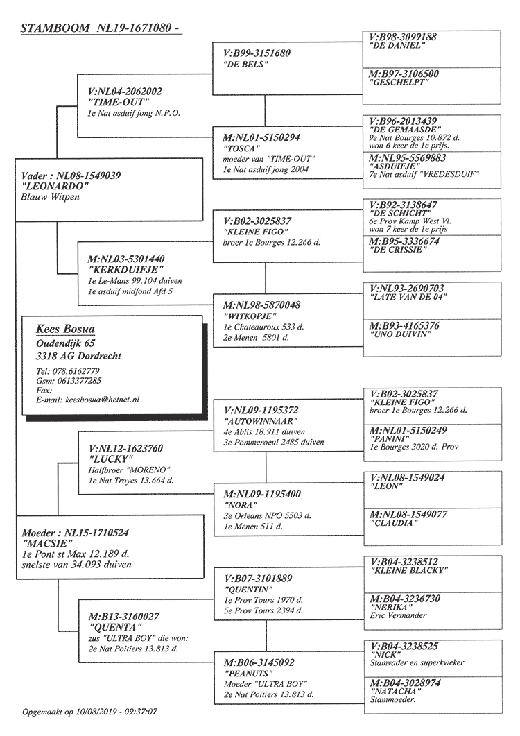Zoon van topkweker “Leonardo” x topvliegster “Macsie” (1e Pont St. Max 12.808 d. / snelste Prov. 34.093 d., 1e Duffel 3872 d. / snelste 12.985 d. etc.). Het beste van Bosua!