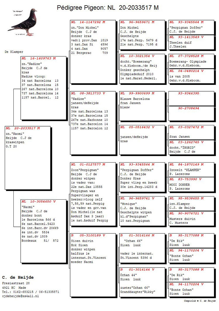 Dochter van “Blauwe Barcelona” (102e Nat. Barcelona en voorts 201-278-280e Nat. etc. uit de oude basis Van Peperstraten x Theelen) x 05-632 (uit 03-472 “Zoon Stamkoppel” Fran Jansen x 03-745 “Dochter Ingrid” Cor de Heijde).