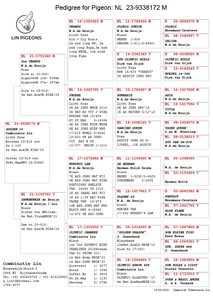 Zoon van “Floris Junior” x “Dochter Olympic Niels” (Dirk Van Dyck) en broer van “Red Rum”, 1e Nat. Asduif jong Pipa 2020.