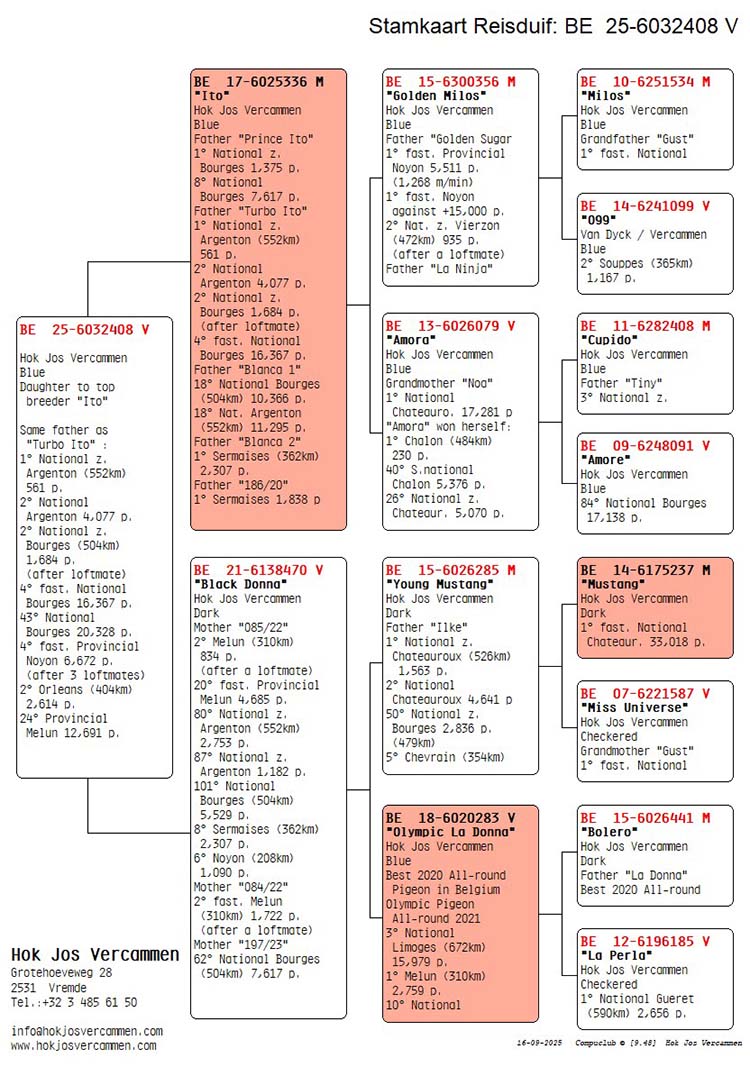 Halfzus van “Turbo Ito” (2e Belgische Asduif Allround World Best Pigeon FCI 2025 met 2e en 4e Nat.), “Blanca 1” (medewinnaar 1e Nat. Kampioen grote halve fond KBDB 2022), “Prince Ito” (1e Nat. Zone Bourges 1375 d. / 8e Nat. 7617 d.), “Blanca 2” (1e Sermaises 2307 d.) etc.