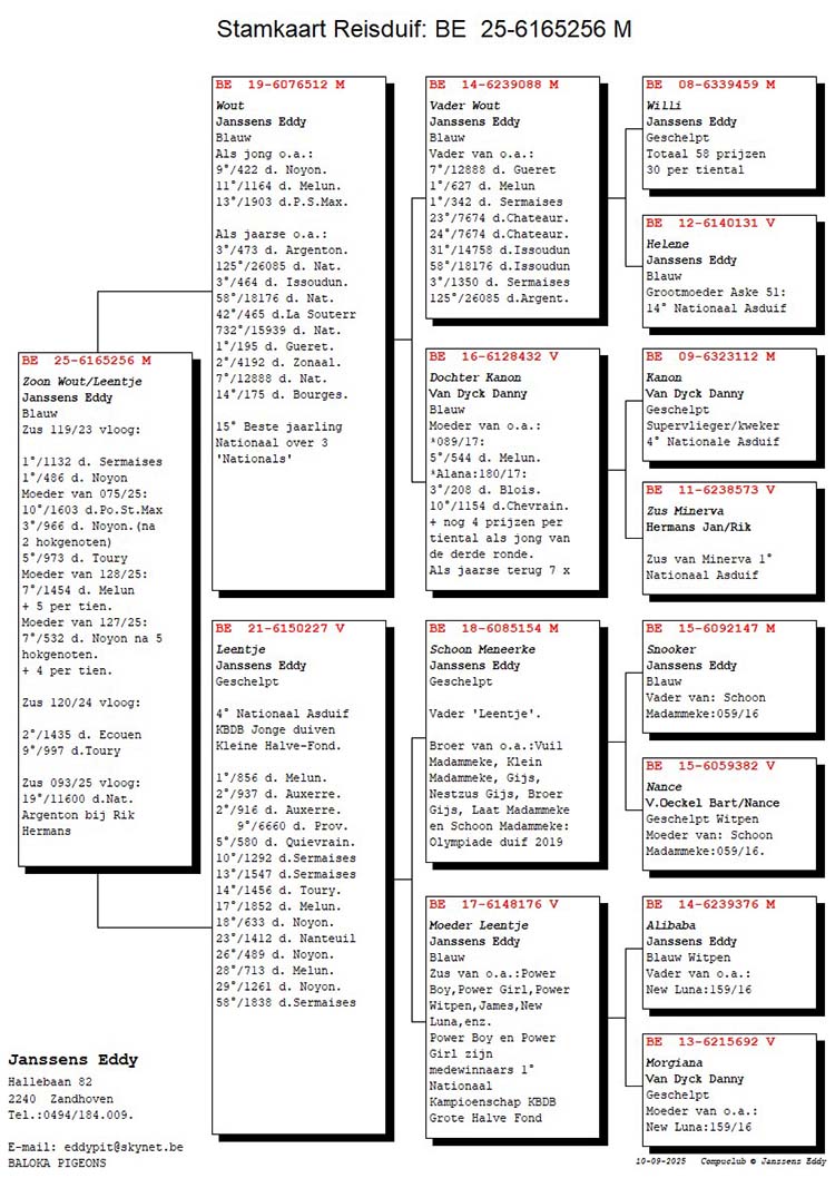 Broer van diverse topduiven zoals 20-012 (24e Nat. Chateauroux 7674 d. en 31e Nat. Issoudun 14.758 d.), 20-112 (1e Melun 627 d., 1e Sermaises 342 d. en 23e Nat. Chateauroux 7674 d.), 21-211 (1e Noyon 405 d.) en 23-111 (26e Nat. Bourges 18.785 d. / 5e Nat. Zone 3552 d.)!