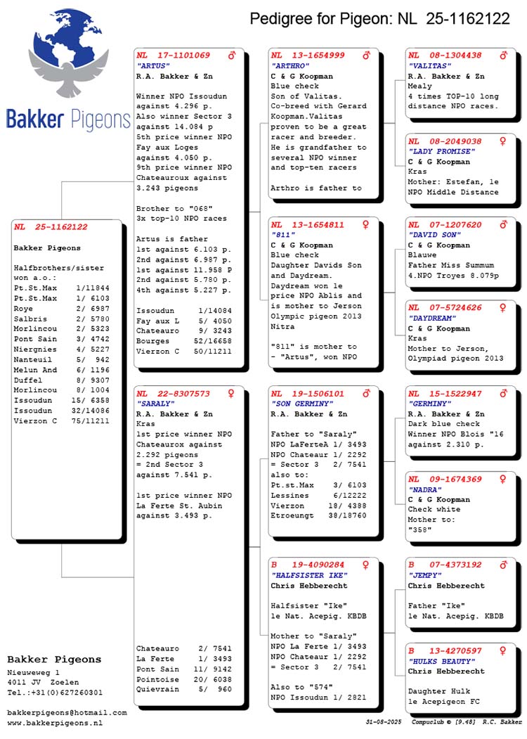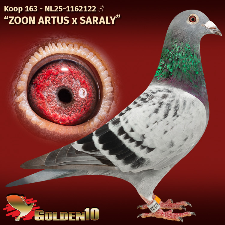 Zoon van de absolute topduiven “Artus”, 1e Nat. S3 Issoudun 14.084 d. en “Saraly”, 1e NPO La Ferte St. Aubin 3493 d. en 1e NPO Chateauroux 2292 d.