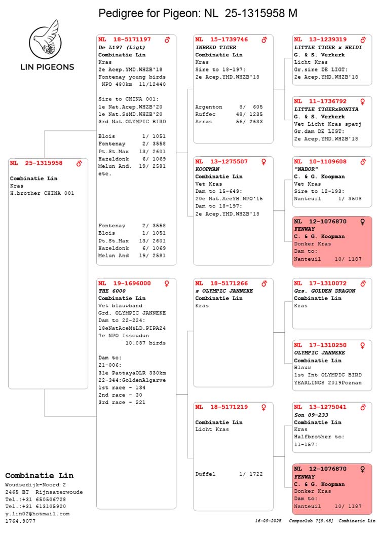 Via moeder bovendien halfbroer van 22-224 (18e Nat. Asduif midfond/fond Pipa 2024 met 1e Issoudun 2952 d. / 7e NPO 10.087 d., 4e Melun 1254 d., 11e Essen 2691 d., 18e Quievrain 9226 d., 28e Arras 759 d. etc.) en 21-619 (5e Niergnies 2195 d., 6e Issoudun 1438 d., 9e Pont Ste. Max. 10.291 d., 9e Pontoise 8706 d., 11e Pontoise 3155 d. etc.).