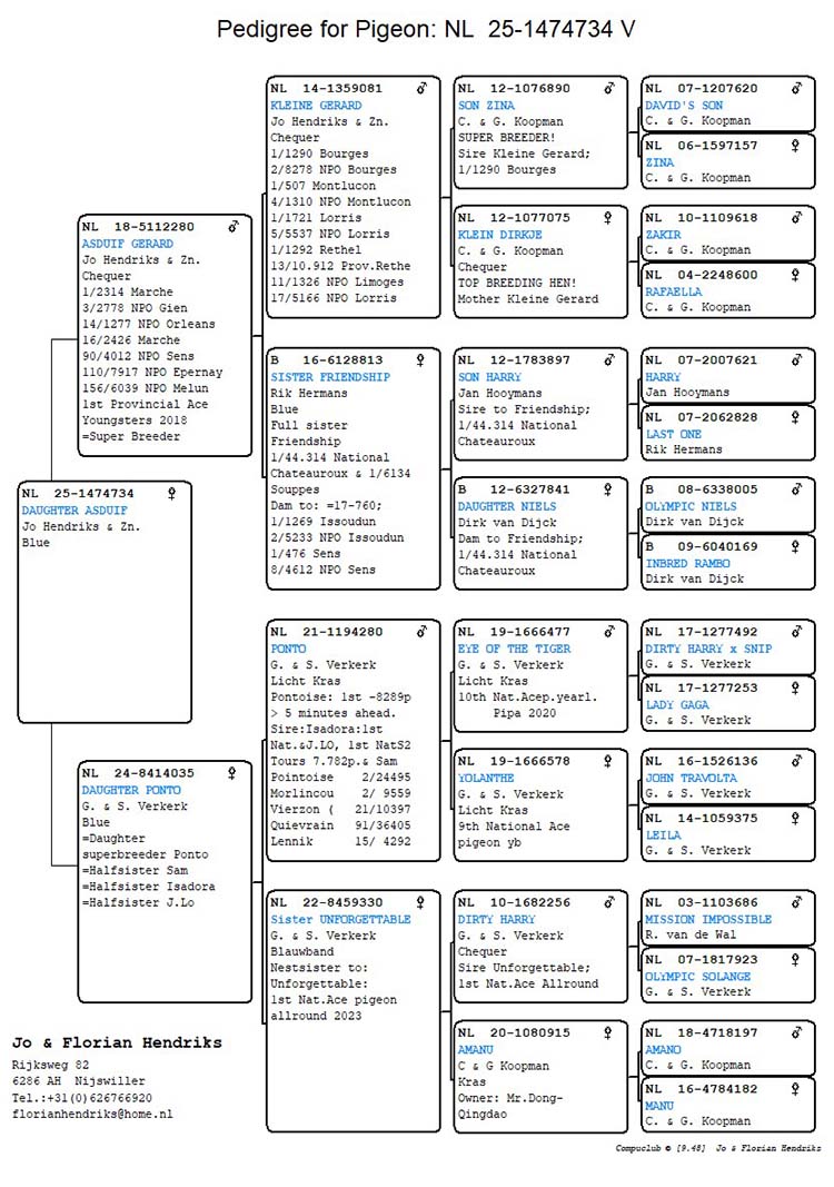 Derhalve halfzus van “Isadora” (1e Nat. Asduif midfond en midfond/fond Pipa 2024 met 1e S-Nat. Issoudun 23.412 d.), “Sam” (1e Nat. Asduif midfond/fond Pipa 2023) en “J.Lo” (2e Nat. Asduif fond Pipa 2023).