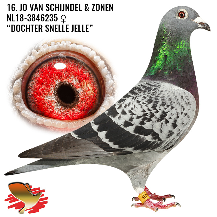 Overgrootvader van o.a. 1e Internat. Pau 13.128 d. 2020 (H. Kalter), 1e Nat. St. Vincent 12.255 d. 2020 (W. Gielen) 2e Nat. Bergerac 25.628 d. 2020 (Arjan Beens), 1e Internat. Asduif Barcelona 2018-2021 (H. Versteegde) etc.