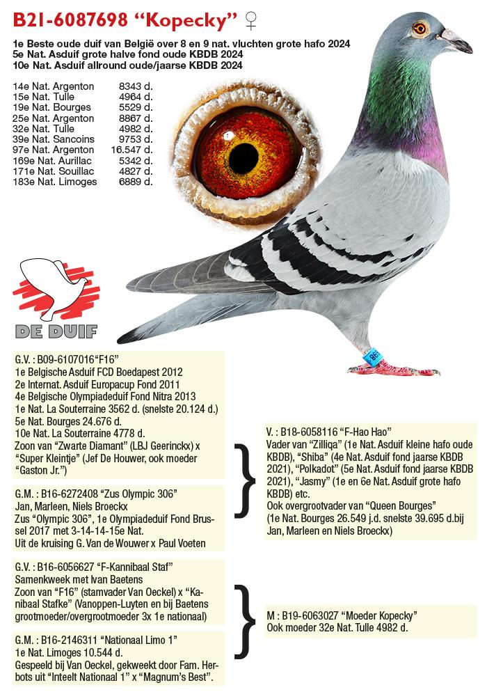 | 1e Nat. Asduif Grote halve fond KBDB 2025 1e Nat. Asduif Kleine halve fond KBDB 2022 1e Beste duif 8 vluchten Grote halve fond 2024 1e Beste duif 9 vluchten Grote halve fond oude 2024 1e Beste duif 9 vluchten Grote halve fond jaarse 2024 1e Nat. Kampioen Fond KBDB 2021 1e Asduif Olympic Hope marathon 2020 1e Superstar van het Jaar Fond Gouden Duif 2021 1e Algemeen Prov. Kampioen KBDB Antwerpen 2025 2e Nat. Asduif Fond KBDB 2021 2e Beste duif 5 vluchten Grote halve fond 2024 2e Beste duif 7 vluchten Grote halve fond 2024 2e Olympiadeduif Marathon Roemenië 2022 2e Olympiadeduif jaarse Roemenië 2022 3e Nat. Asduif Allround KBDB 2021 3e Olympiadeduif Halve fond Roemenië 2022 |