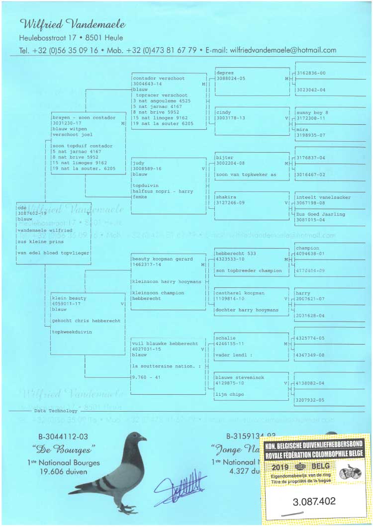 G.M.: B15-4027031 “Vuil Blauwke”. Versierde o.a. de 41e NAT La Souterraine ’15 – 9.760 d. Gekweekt van de fameuze “Schalie” Gevaert-Lannoo x “Blauw Steveninck” (uit broer “Chipo”).