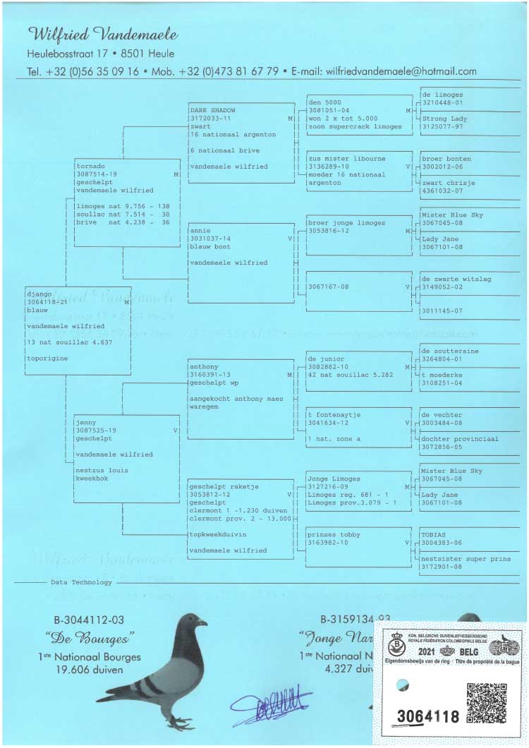G.V.: B11-3172033 “Dark Shadow”. Won o.a. 6e NAT Brive en 16e NAT Argenton. Zoon van de “000” x “zus Libourne”, of de fundatie van de kolonie Vandemaele.